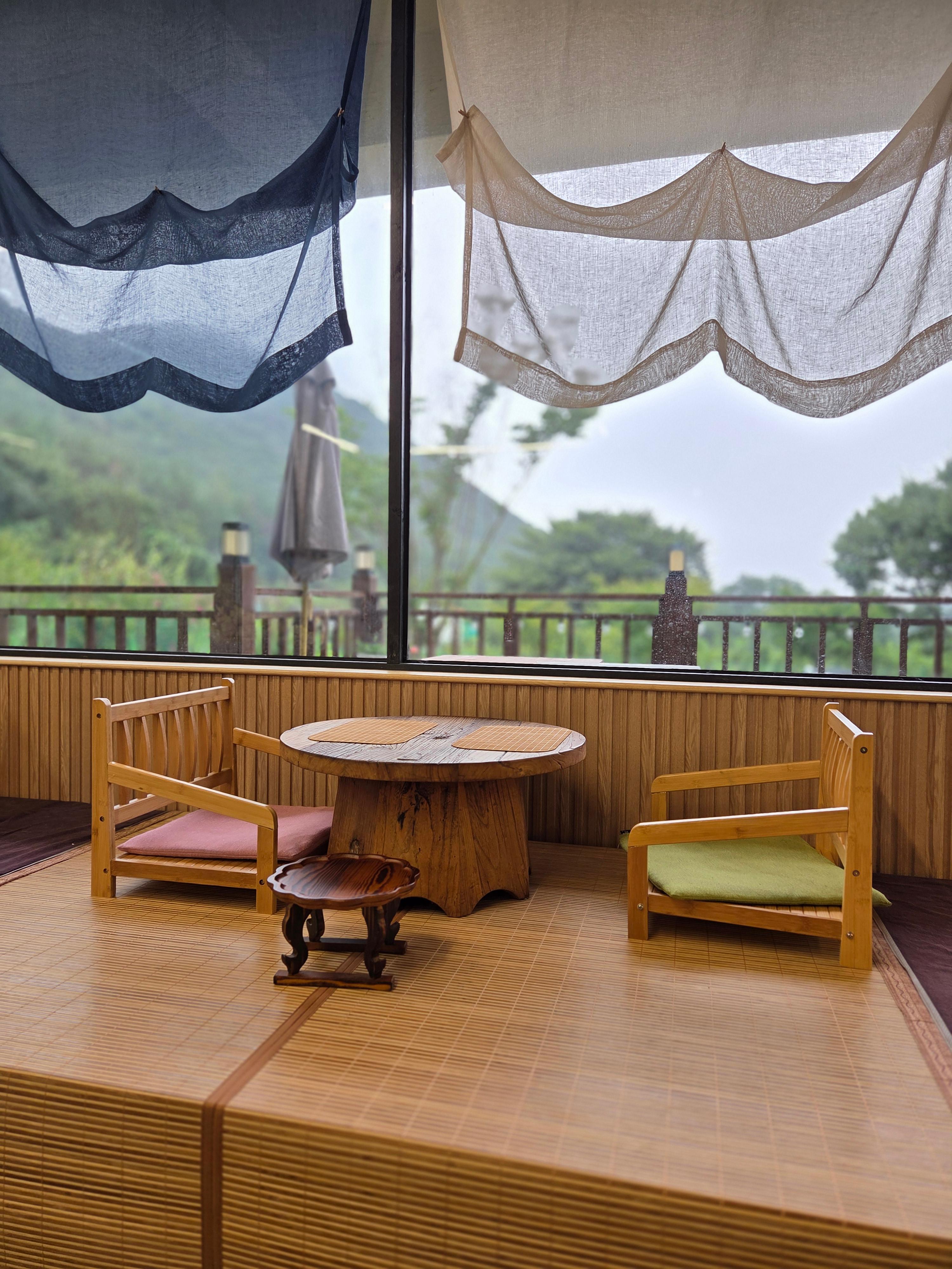 • 고즈넉하고 편안한 인테리어: 내부는 통창으로 들어오는 햇살과 원목 가구, 곳곳에 놓인 다기 세트들이 어우러져 따뜻하고 전통적인 분위기를 자아냅니다. 평상 형태의 좌식 테이블도 마련되어 있어 더욱 편안한 시간을 보낼 수 있습니다.