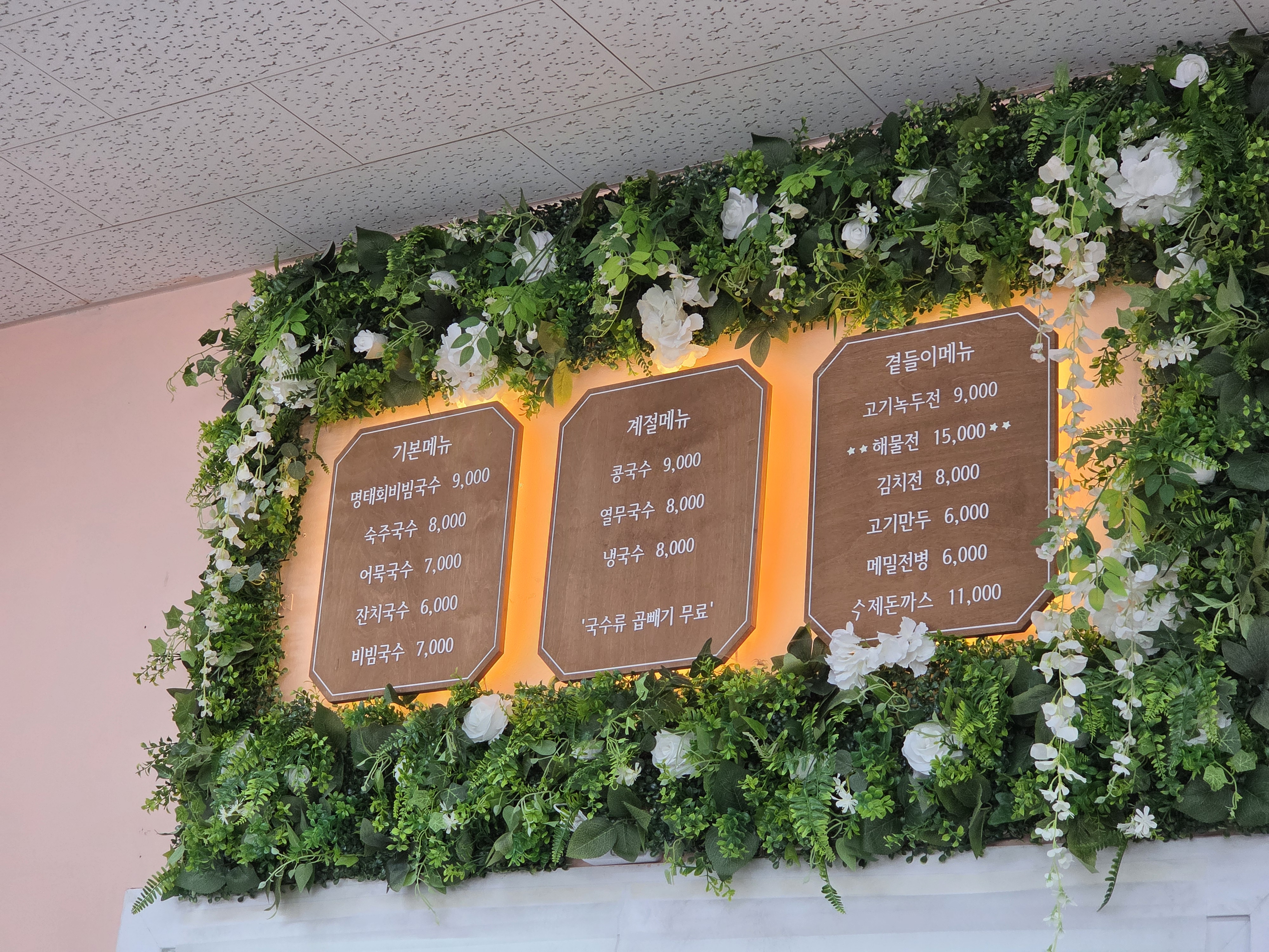 - 기본메뉴: 명태회비빔국수, 숙주국수, 어묵국수, 잔치국수, 비빔국수
